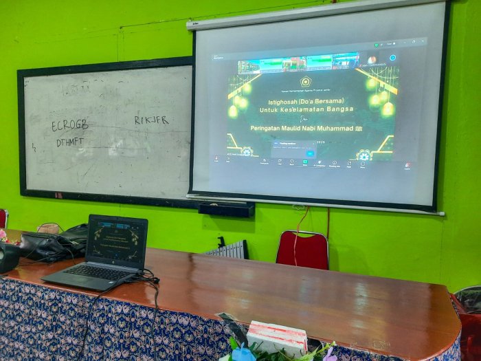Suka Jaya (MTsN 1 Bungo) – MTsN 1 Bungo ikuti kegiatan “Istigosah (Do’a Bersama) Untuk Keselamatan Bangsa dan Peringatan Maulid Nabi Muhammad SAW, yang diadakan oleh Kanwil Kemenag Jambi melalui zoom (daring) bagi seluruh satuan kerja di bawah Kantor Kementerian Agama Provinsi Jambi, Senin (1/09/2025). Kegiatan ini dilaksankan di Ruang Serbaguna MTsN 1 Bungo, dan diikuti oleh seluruh GTK MTsN 1 Bungo.