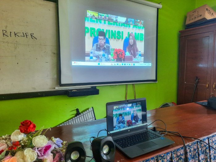 Suka Jaya (MTsN 1 Bungo) – Pada Kamis, 4 September 2025, MTs Negeri 1 Bungo hadiri Pertemuan yang membahas ”Pembinaan bagi Guru dan Kepala Madrasah” se-Provinsi Jambi melalui zoom (daring) . Kegiatan ini difasilitasi oleh Kanwil Kementerian Agama Provinsi Jambi bagian Bidang Pendidikan Madrasah Kantor Wilayah Kementerian Agama Provinsi Jambi. Kegiatan ini dibuka dan diresmikan langsung oleh Kepala Kanwil Kemenag Jambi, Dr. H. Mahbub Daryanto, M.Pd.I.