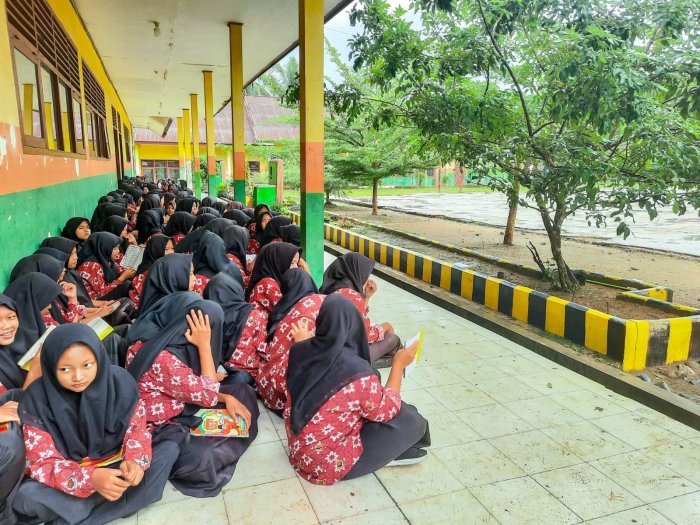 Cuaca pagi ini begitu syahdu di langit MTsN 1 Bungo. Lapangan basah dikarenakan hujan, tetapi pelaksanaan kegiatan pagi ini tetap berjalan didampingi para guru piket. Tampak para peserta didik mengambil tempat di teras kelasnya. Melantunkan sholawat dan bacaan-bacaan surah juz 30 dengan antusias dengan bimbingan guru piket.