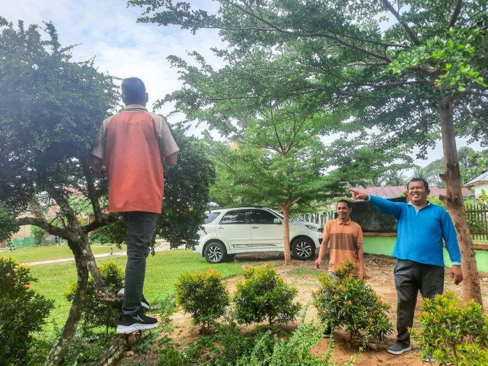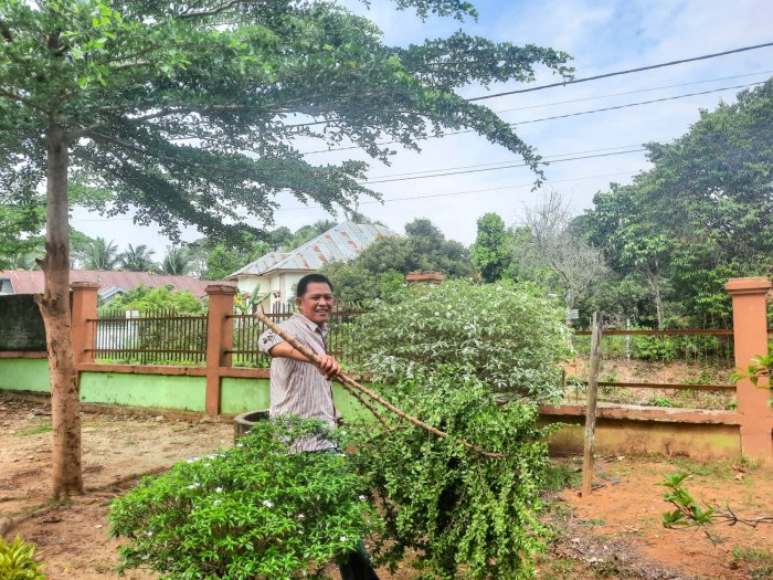 Para tenaga pendidikan terlihat sigap membuang kembang-kembang layu dari tanaman-tanaman hias. Mereka menggunakan gunting khusus yang bersih dan tajam, memastikan setiap potongan rapi dan tidak merusak batang tanaman. "Memangkas bunga yang sudah kering itu penting sekali. Kalau tidak dipangkas, energi tanaman akan habis untuk membuat biji, bukan untuk menumbuhkan bunga baru," jelas Bapak Candra, salah satu tenaga pendidikan di MTsN 1 Bungo.