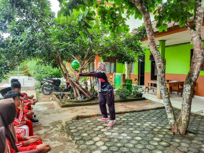 Dalam kegiatan ini, Fitra Hayati, S.Pd., langsung memperagakan gerakan under pass dengan tujuan agar peserta didik lebih mudah memahami teknik dasar permainan bola besar tersebut. Dengan penuh semangat, beliau mencontohkan posisi badan, cara merapatkan tangan, serta mengarahkan bola dengan benar.