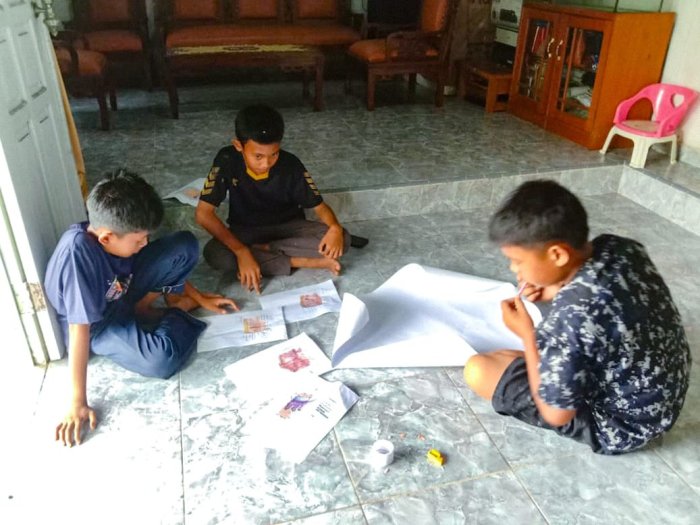 "Abrar salah satu anggota kelompok, mengatakan, "Kerja di rumah begini lebih santai tapi tetap serius. Kami bisa fokus mencari bahan dan membagi tugas dengan lebih leluasa. Karena bahannya banyak, perlu waktu lebih dari jam madrasah untuk menyelesaikannya dengan baik."