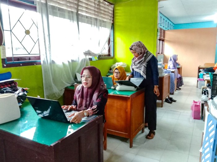 Salah seorang guru, Ibu Ermiyati, S.Ag., yang terlihat tekun di depan laptopnya, menyampaikan, “Meskipun sedikit menyita waktu pagi, ini adalah bagian dari tanggung jawab kita sebagai ASN. Harus selesai sebelum fokus penuh pada kegiatan mengajar.”