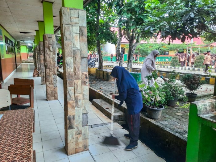 Suka Jaya (MTsN 1 Bungo) - Dalam upaya mewujudkan madrasah yang bersih, nyaman, dan bermutu, para guru piket Sabtu MTsN 1 Bungo melaksanakan kegiatan kebersihan dengan penuh tanggung jawab. Kegiatan tersebut meliputi menyapu selasar ruang guru, lorong madrasah, serta area sekitar halaman utama. (25/10)