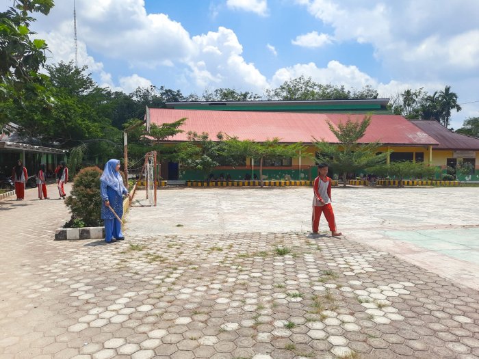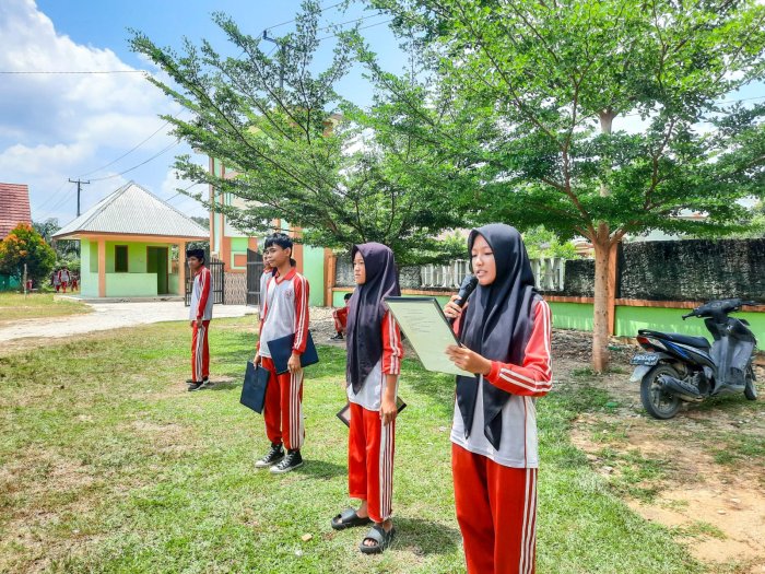 Suka Jaya (MTsN 1 Bungo) - Semangat pantang menyerah ditunjukkan oleh siswa-siswi kelas IX D MTsN 1 Bungo saat melaksanakan latihan upacara bendera di lapangan madrasah, Sabtu (1/11). Meskipun matahari bersinar terik, para peserta tetap berlatih dengan penuh disiplin dan kekompakan.