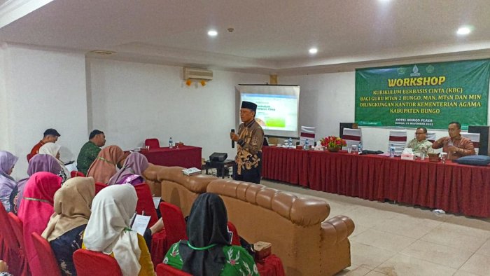 Suka Jaya (MTsN 1 Bungo) - Wakil Kepala Bidang Kurikulum MTsN 1 Bungo, Ibu Elfira Zuhria, S.Pd.I., kembali melanjutkan kegiatan Workshop Kurikulum Berbasis Cinta (KBC) yang digelar di Hotel Wiltop. Setelah waktu Ishoma (istirahat, shalat, dan makan), kegiatan dilanjutkan dengan sesi materi yang disampaikan oleh Bapak Asrul, S.Ag., M.Pd.I., selaku Pengawas Madrasah Kantor Kementerian Agama Kabupaten Bungo. (1/11)