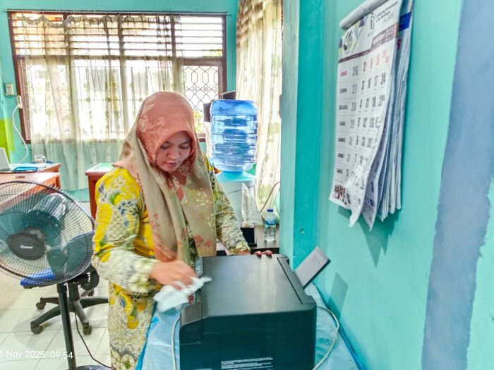 Suka Jaya (MTsN 1 Bungo) - Kelancaran proses administrasi di MTsN 1 Bungo menjadi prioritas utama. Untuk memastikan efisiensi layanan dan mendukung penuh kegiatan belajar mengajar (KBM), para staf madrasah secara konsisten dan terjadwal melaksanakan kegiatan pemeliharaan serta perawatan sarana dan prasarana kantor, khususnya alat-alat elektronik esensial. (6/11)