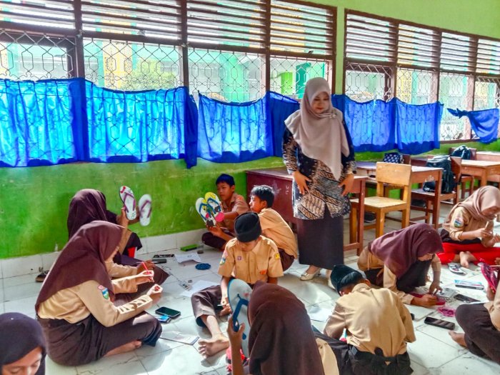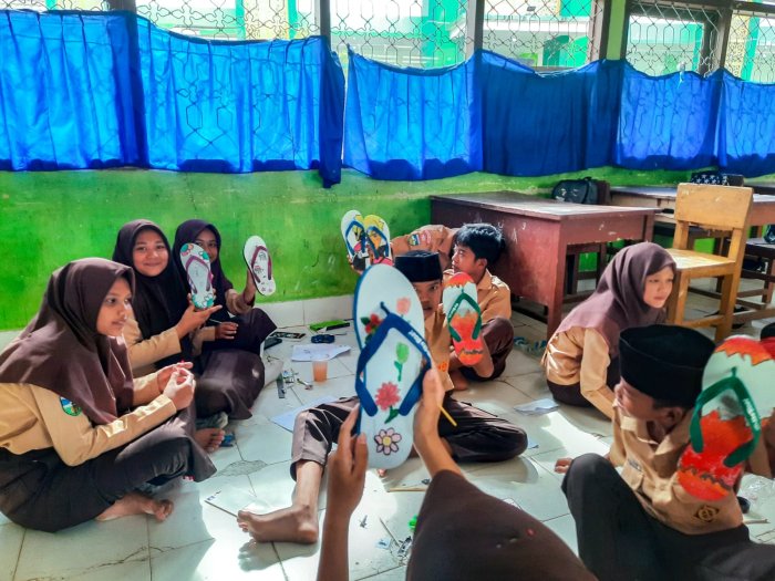 Kegiatan ini merupakan bagian dari materi pembelajaran seni rupa, khususnya mengenai gambar ilustrasi. Alih-alih menggunakan kertas atau kanvas biasa, Ibu Elfira menantang para siswa untuk berinovasi dengan memanfaatkan permukaan sandal jepit yang terbuat dari bahan karet.