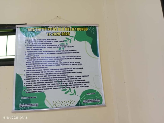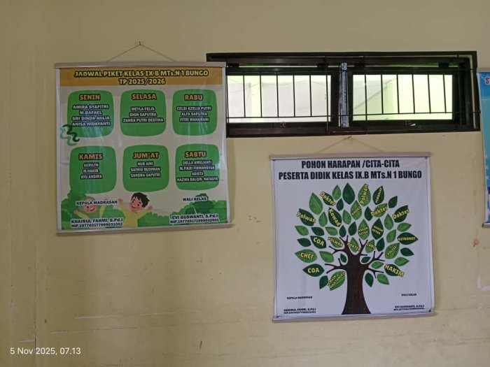 Struktur Organisasi dan Daftar Piket yang Jelas: Memasang struktur kelas dan jadwal piket yang up-to-date berfungsi untuk menanamkan rasa tanggung jawab dan kedisiplinan pada setiap siswa.