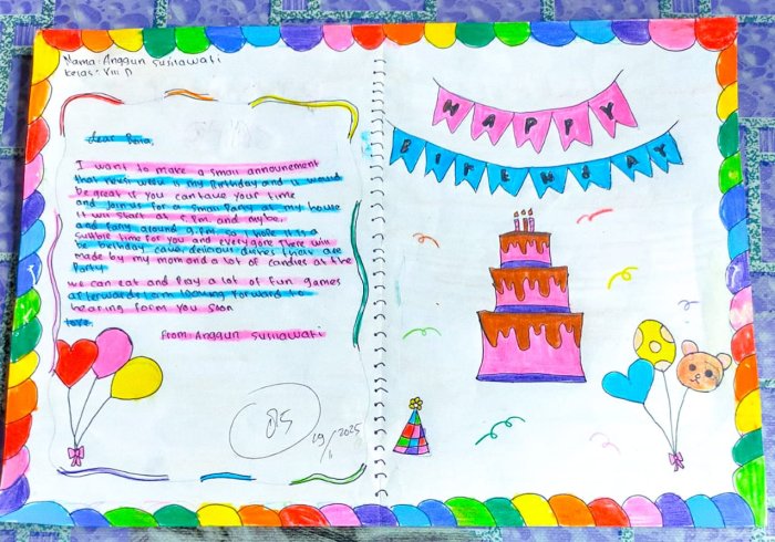 Kegiatan ini tidak hanya bertujuan memahami struktur invitation secara teori, tetapi juga mengembangkan kreativitas dan keterampilan berbahasa Inggris secara aplikatif. Para peserta didik diminta merancang kartu undangan pesta ulang tahun dengan desain kreatif sekaligus menyusun teks undangan yang tepat, menarik, dan komunikatif.