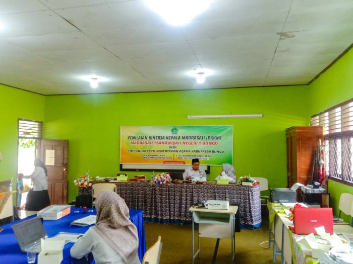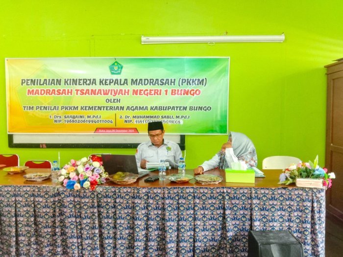 Suka Jaya (MTsN 1 Bungo) - Pelaksanaan Penilaian Kinerja Kepala Madrasah (PKKM) di MTsN 1 Bungo berjalan lancar dan terperinci. Sorotan utama dalam kegiatan asesmen kali ini jatuh pada salah satu guru senior, Ibu Fadilah, S.Ag., yang bertindak sebagai perwakilan guru dalam memaparkan kelengkapan dan ketertiban administrasi guru di hadapan tim Pengawas. (8/12)