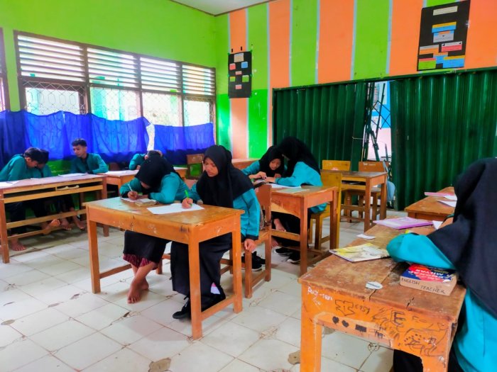 Dalam kegiatan pembelajaran, guru mengajak siswa mengulas penggunaan simple present dalam kehidupan sehari-hari melalui contoh kalimat sederhana, dialog singkat, serta latihan soal yang interaktif. Suasana kelas tampak hidup dengan partisipasi aktif siswa yang berani mencoba menyusun kalimat dan menjawab pertanyaan.
