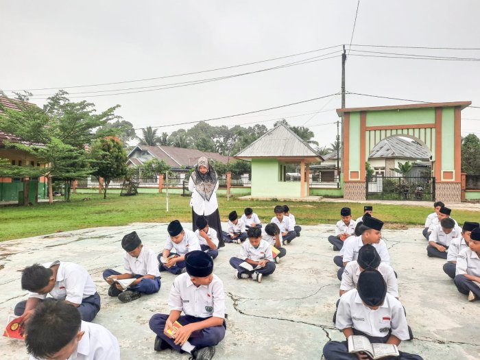 Suka Jaya (MTsN 1 Bungo) - MTsN 1 Bungo terus menanamkan nilai-nilai keimanan dan ketakwaan kepada peserta didik melalui pelaksanaan pengajian rutin pagi yang dilaksanakan sebelum kegiatan belajar mengajar dimulai. Kegiatan ini berlangsung dengan khidmat dan penuh makna, dipandu serta dibimbing oleh guru piket, Ibu Ermiyati, S.Ag., dan Ibu Meli Adriyani, S.Pd.I. (20/1)