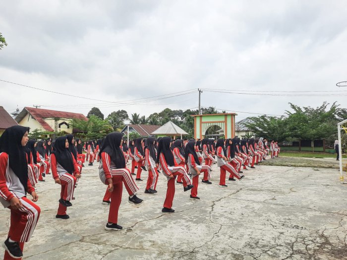 Suka Jaya (MTsN 1 Bungo) - MTsN 1 Bungo kembali menghadirkan suasana penuh keceriaan melalui kegiatan Senam Sehat dalam rangka Sabtu Ceria yang dilaksanakan di halaman utama MTsN 1 Bungo, Sabtu pagi. Kegiatan ini menjadi agenda rutin yang bertujuan menjaga kebugaran jasmani sekaligus mempererat kebersamaan seluruh warga madrasah. (24/1)