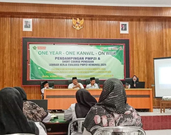 Suka Jaya (MTsN 1 Bungo) - MTsN 1 Bungo turut ambil bagian dalam kegiatan “Pendampingan PMPZI (Penilaian Mandiri Pembangunan Zona Integritas) & Short Course Pengisian Lembar Kerja Evaluasi PMPZI Kemenag 2026” yang dilaksanakan di Aula Kantor Kementerian Agama Kabupaten Bungo. Kegiatan ini diikuti oleh berbagai satuan kerja di lingkungan Kementerian Agama sebagai upaya memperkuat pembangunan Zona Integritas menuju wilayah bebas dari korupsi dan peningkatan kualitas pelayanan publik. (10/3)